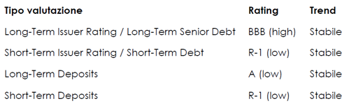 • Long-Term Issuer Rating a BBB (high) da BBB, trend Stabile